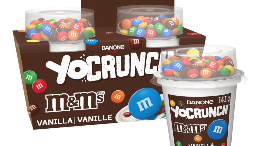 The products come in two adjoining containers, a base filled with yogurt and a separately sealed topper with various add-ins like Oreo pieces, mini M&M’s candies, Snickers and Twix.